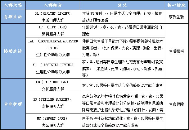 在******节我们说到,通过“前景养老全阶段分时频谱”我们把老人主要分为“自理生活、协助生活、专业护理”三大类。而根据老年人身体状况及养老的核心需求不同,我们将养老人群进一步细分为7类(HL/LC/IAL/AL/CN/SN/MC)详见下表: